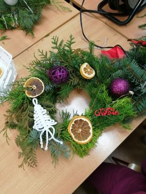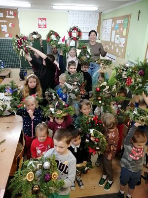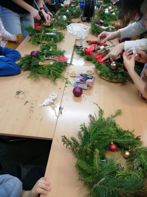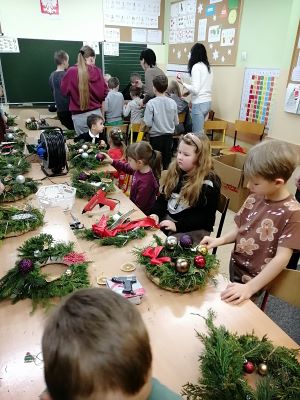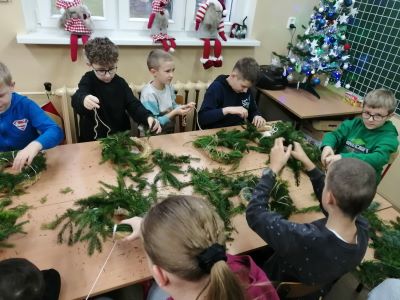 Młodsze klasy z ogromnym zaangażowaniem tworzyły piękne, pachnące lasem wianki świąteczne. Dzieci wykazały się kreatywnością i starannością, ozdabiając swoje prace bombkami, wstążkami oraz naturalnymi dodatkami. Każdy wianek był niepowtarzalny i pełen świątecznego uroku.