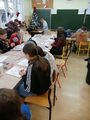 Starsze klasy przygotowywały bożonarodzeniowe obrazki. Uczniowie wykorzystali różnorodne techniki plastyczne, tworząc prace przedstawiające zimowe krajobrazy, choinki oraz świąteczne motywy. Powstały prawdziwe małe dzieła sztuki, które z pewnością wprowadzą wszystkich w magiczny nastrój Świąt.